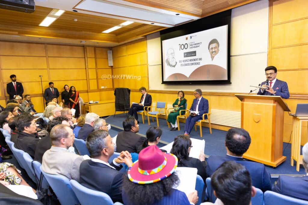 தொழிலாளர்கள் சுயமரியாதை கொண்டவர்களாக உரிமைகளைப் பெற வேண்டும் என்று இங்கிலாந்தில், தான் பங்கேற்றக் கூட்டத்தில் பேசியவர் பெரியார். அவருடைய சுயமரியாதை இயக்கத்தின் நூற்றாண்டு விழாவில் இங்கிலாந்தில் உள்ள ஆக்ஸ்ஃபோர்ட் பல்கலைக்கழகத்தில் அவருடைய படத்தை, பெரியாரின் கொள்கை வாரிசாக-இயக்கத்தின் நான்காம் தலைமுறைத் தலைவராகத் திறந்து வைத்து உரையாற்றினார் தமிழ்நாடு முதலமைச்சர். சுயமரியாதை இயக்கத்தின் தாக்கம் குறித்த ஆய்வுப் புத்தகங்கள் வெளியிடப்பட்டு, இரண்டு நாள் கருத்தரங்கமும் நடைபெற்றது.