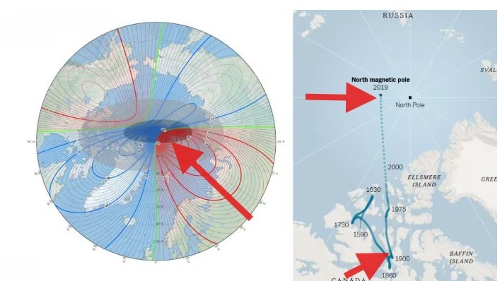 காந்த வட துருவம் ஆண்டுக்கு சுமார் 35 முதல் 60 கிலோமீட்டர் வரை நகர்ந்து வருகிறது. இதற்கு முன்பு இவ்வளவு வேகமாக நகர்ந்ததில்லை. கடந்த சில தசாப்தங்களில் இந்த நகர்வு வேகம் அதிகரித்துள்ளது.