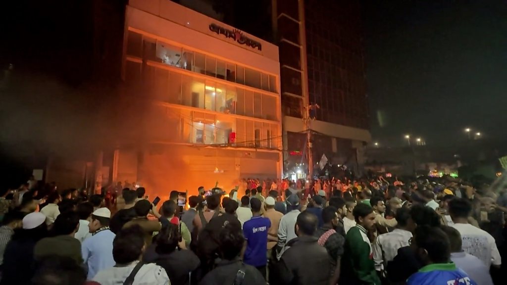 மேலும், போராட்டக்காரர்கள் டாக்காவில் உள்ள ‘புரோதோம் ஆலோ’ (Prothom Alo) மற்றும் ‘தி டெய்லி ஸ்டார்’ (The Daily Star) ஆகிய முன்னணி பத்திரிகை அலுவலகங்களை அடித்து நொறுக்கி தீ வைத்தனர். இதனைத்தொடர்ந்து, கட்டிடத்திற்குள் இருந்த ஊழியர்கள் மற்றும் பத்திரிகையாளர்கள் உள்ளே சிக்கினர்.அவர்களை சுமார் 4 மணிநேர போராட்டத்தின் பின் தீயணைப்பு துறை மற்றும் ராணுவத்தினர் மீட்டனர்.